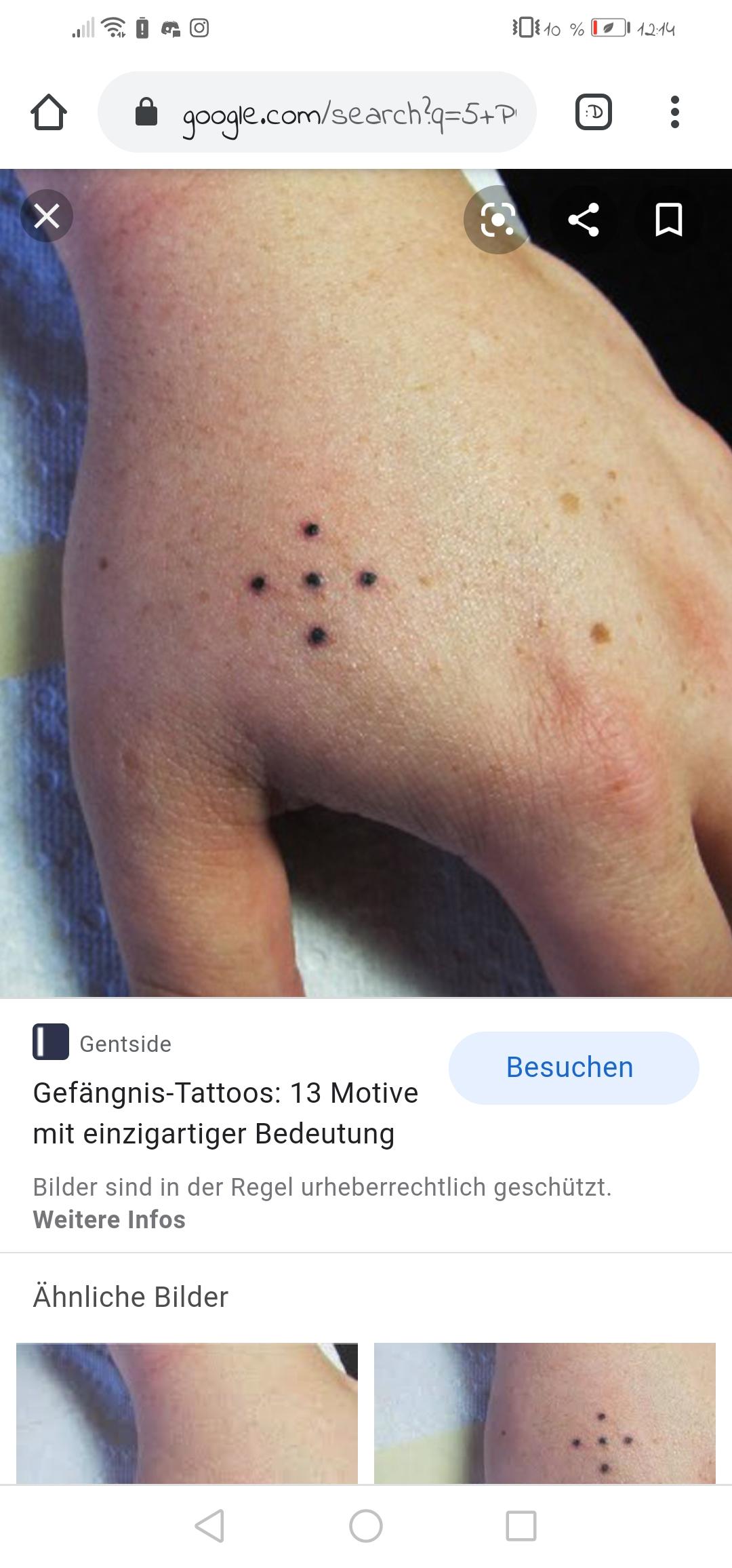Tätowierung drei punkte zwischen daumen und zeigefinger. Was bedeuten die drei blauen tätowierten Punkte Dreieckform zwischen Zeigefinger und Daumen. In Form eines Dreiecks angeordnet befinden Sie sich an der Hand. Frage mich jetzt ob das etwas bedeutet oder nicht.